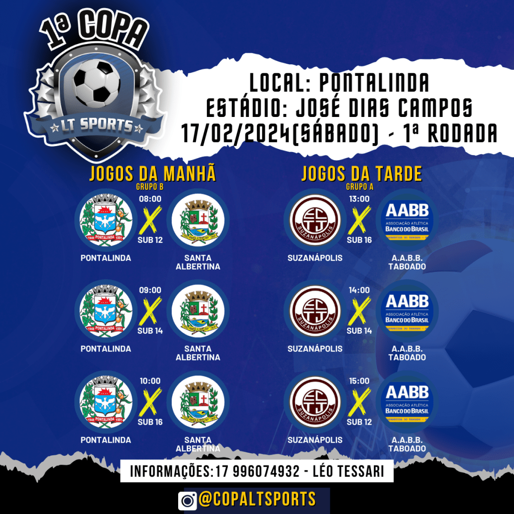 A fase de grupos da Copa LT Sports começa no dia 17 de fevereiro, os jogos será em Pontalinda à partir das 08h da manhã.